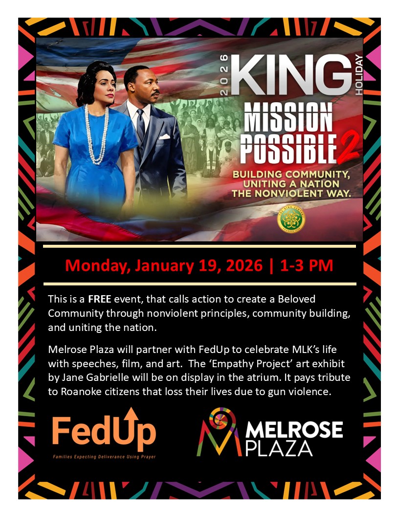 In addition, art panels created for The Empathy Project — a community initiative that highlights the personal stories and experiences of local leaders and families affected by gun violence and encourages reflection and connection — will be on display in the atrium at Melrose Plaza from January 15 through January 24, 2026. For more details about the project’s goals and community impact, visit the Empathy Project page on the Roanoke Arts Commission website.